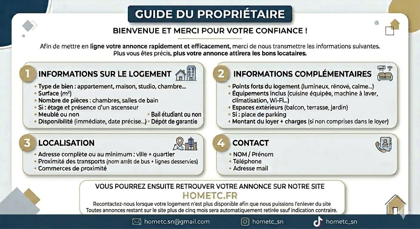 Vous trouverez ci-dessous le GUIDE DU PROPRIETAIRE avec toutes les informations à nous retourner à l’adresse mail « hometc.sn@gmail.com » pour pouvoir créer l’annonce de votre logement.